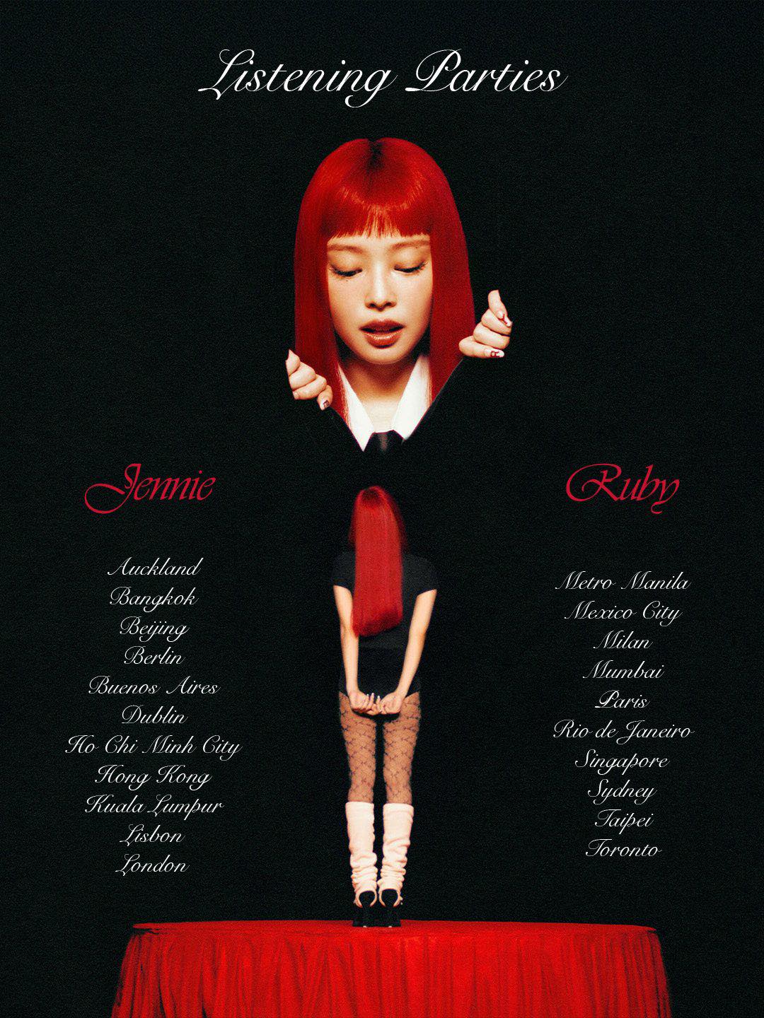Trước đó, Jennie đã tổ chức listening party tại Seoul, Hàn Quốc, có sự tham gia của Zico và diễn viên Yeo Jin Goo. Listening party của Jennie tại Seoul được trang trí hoành tráng với tone đỏ chủ đạo, đúng concept album. Fan đến dự được nghe nhạc trước và mang về nhiều phần quà giá trị do chính Jennie chuẩn bị. Nữ rapper cũng khoe loạt ảnh check-in tại sự kiện, khiến người hâm mộ càng phấn khích hơn khi Jennie công bố listening party ở 21 thành phố.