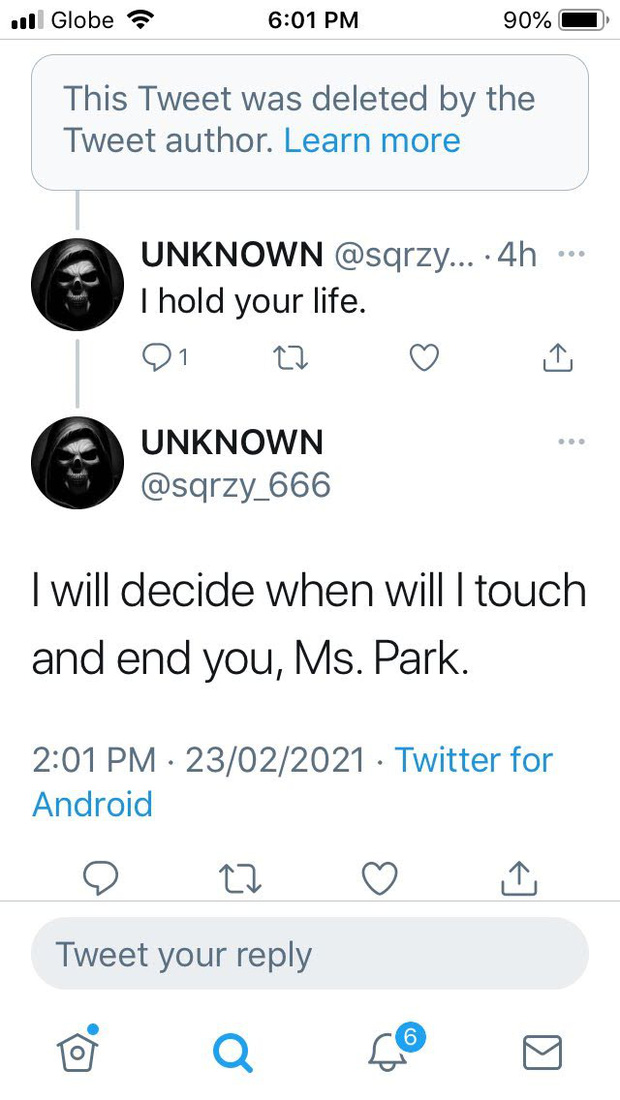 Cụ thể, có một kẻ ẩn danh trên Twitter tự nhận là "thiên thần của cái chết" đã đăng tải hàng loạt bài viết đe dọa tính mạng nữ thần tượng nhóm T-ara. Kẻ này đưa ra những phát ngôn đáng sợ như: "Tôi đang nắm giữ mạng sống của cô" hay "Tôi sẽ quyết định khi nào đến và kết liễu cô, cô Park à". Thậm chí, tên này còn đặt đồng hồ đếm ngược đến ngày 6/6/2021 - được cho là thời điểm hắn muốn ra tay với Jiyeon.