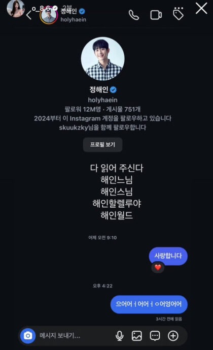 Sau đó, Yuhwa tiếp tục nhắn tin thể hiện sự ngạc nhiên tột độ khi nam diễn viên đình đám này yêu thích tin nhắn riêng tư của cô. Theo nữ streamer, trong cả 2 lần cô chủ động nhắn tin, Jung Hae In đều xem. "Chuyện gì đây, Jung Hae In thích tin nhắn của tôi! Một trái tim! Là trái tim đó. Chúa ơi, anh ấy đọc mọi thứ tôi nhắn. Không thể tin được", Yuhwa chia sẻ. Việc Jung Hae In xem và thả tim tin nhắn riêng tư của người hâm mộ nữ khiến netizen xứ Hàn bàn tán và tranh cãi sôi nổi trên MXH.