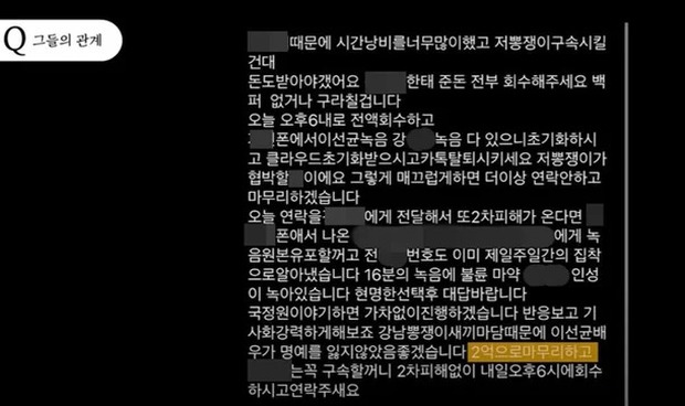 A nhắn tin uy hiếp nam diễn viên họ Lee để đòi gần 4 tỷ đồng: “Nếu anh dám mang mọi chuyện nói với cơ quan chức năng, tôi sẽ không nương tay đâu đấy. Hy vọng danh tiếng của anh không bị tổn hại”.
