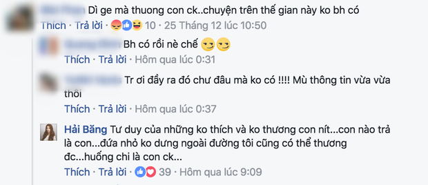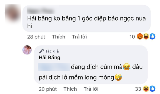 Hôm nay 20/7 trên trang cá nhân, giọng ca Viên Đá Nhỏ đã đăng tải hình ảnh các con đang thưởng thức bữa ăn một cách ngon miệng. Nhiều dân mạng đã dành lời khen cho sự đáng yêu của các nhóc tỳ. Tuy nhiên, một antifan đã đưa ra nhận xét tiêu cực: "Hải Băng không bằng một góc Diệp Bảo Ngọc nữa". Bức xúc vì bị so sánh với vợ cũ của chồng, Hải Băng đáp trả: "Đang dịch cúm mà, đâu phải lở mồm long móng".