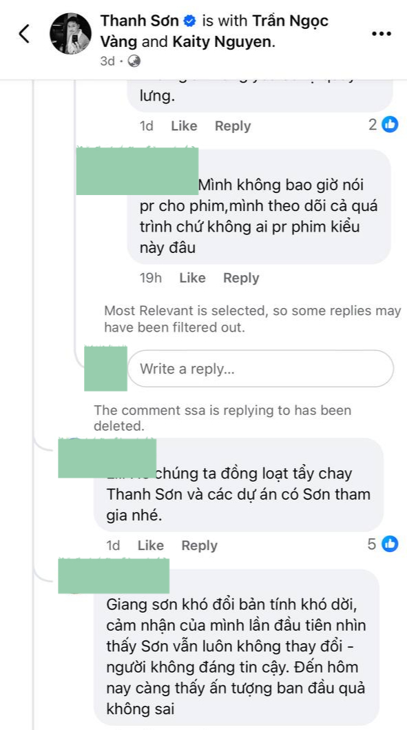 Cụ thể, Thanh Sơn viết: "Xin chào, tôi là Vũ người yêu em An, còn người kia thì… kệ đi. Dù chuyện gì xảy ra, Vũ xin thề chỉ yêu mình em thôi nhé". Giữa thông tin rạn nứt với Khả Ngân đang râm ran khắp các hội nhóm thì dòng trạng thái của Thanh Sơn như "đổ dầu vào lửa". Một bộ phận cư dân mạng vào phần bình luận bày tỏ sự ngán ngẩm với cách PR "phim giả tình thật" của Thanh Sơn. Không những vậy, nhiều netizen còn bức xúc thể hiện thái độ gay gắt với nam diễn viên.