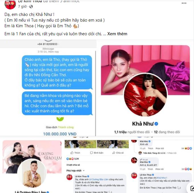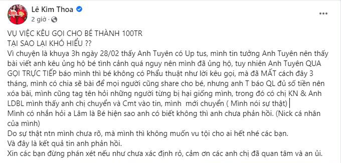 Đáng nói, sau khi đến Bệnh viện Nhi đồng Cần Thơ để xác minh, Kim Thoa nhận được phản hồi không có trường hợp nào như bài đăng các nghệ sĩ trên kêu gọi. Ngay lập tức, Kim Thoa đăng đàn với mong muốn 3 nghệ sĩ trên lên tiếng giải thích về vụ việc này.