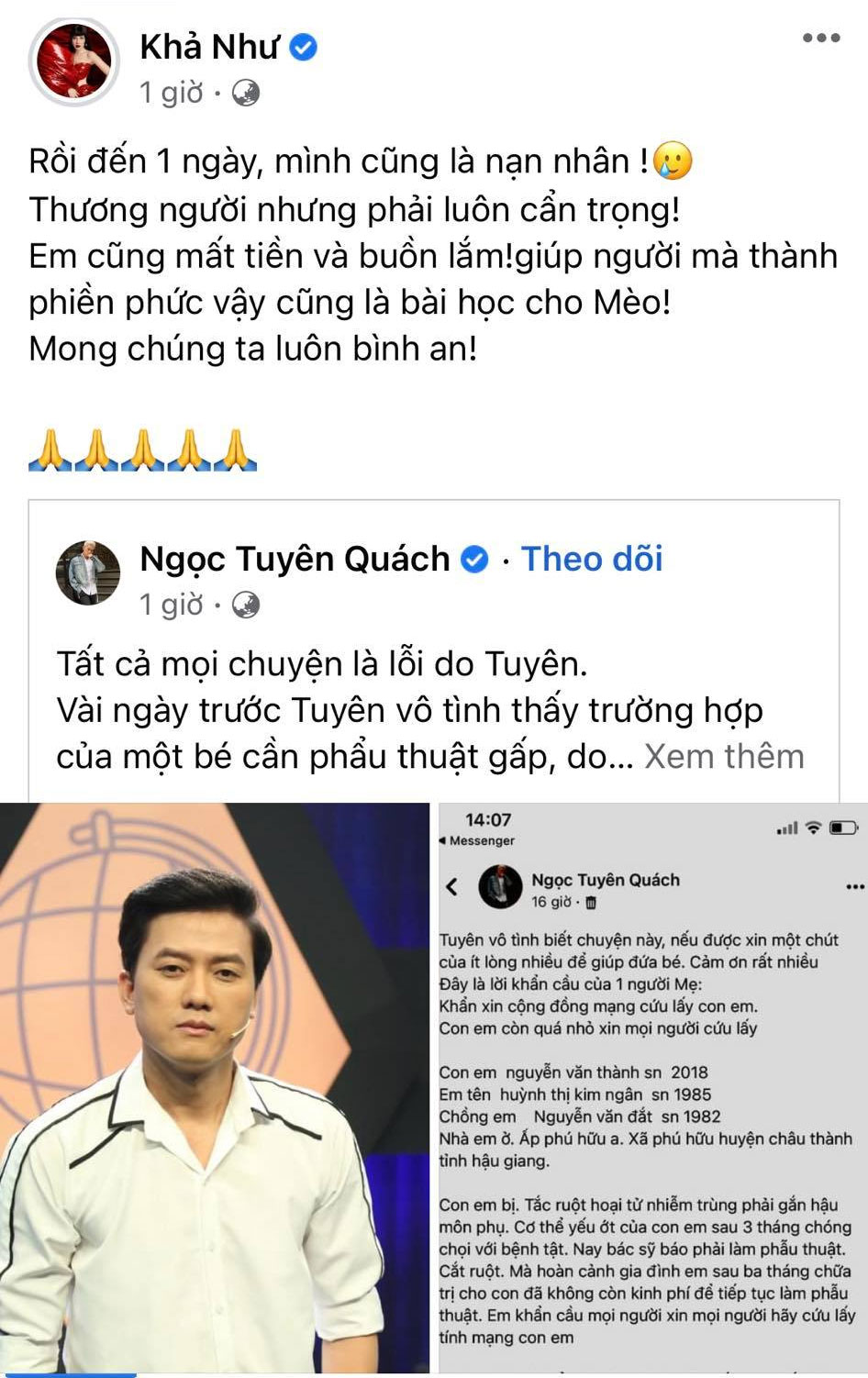 Nam diễn viên viết: "Vài ngày trước Tuyên vô tình thấy trường hợp của một bé cần phẩu thuật gấp, do vội vàng chỉ nghĩ đến việc cứu bé nên Tuyên đã chỉ gọi điện xác minh qua số điện thoại rồi xin được chia sẻ bài. Sau khi tìm hiểu kỹ Tuyên biết rõ mọi chuyện thì lời khẩn cầu này có vấn đề không hay, họ muốn trục lợi. Hôm nay Tuyên muốn thành thật xin lỗi mọi người".