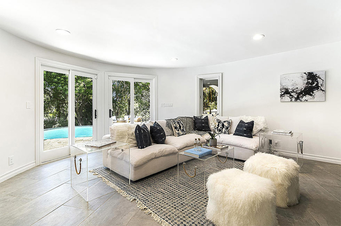 Selena Gomez là người ưa thích gam màu tươi sáng và chú trọng sự ấm cúng, thoải mái. Phòng khách kê nhiều sofa màu kem đặt ở các vị trí khách nhau.