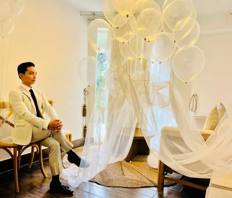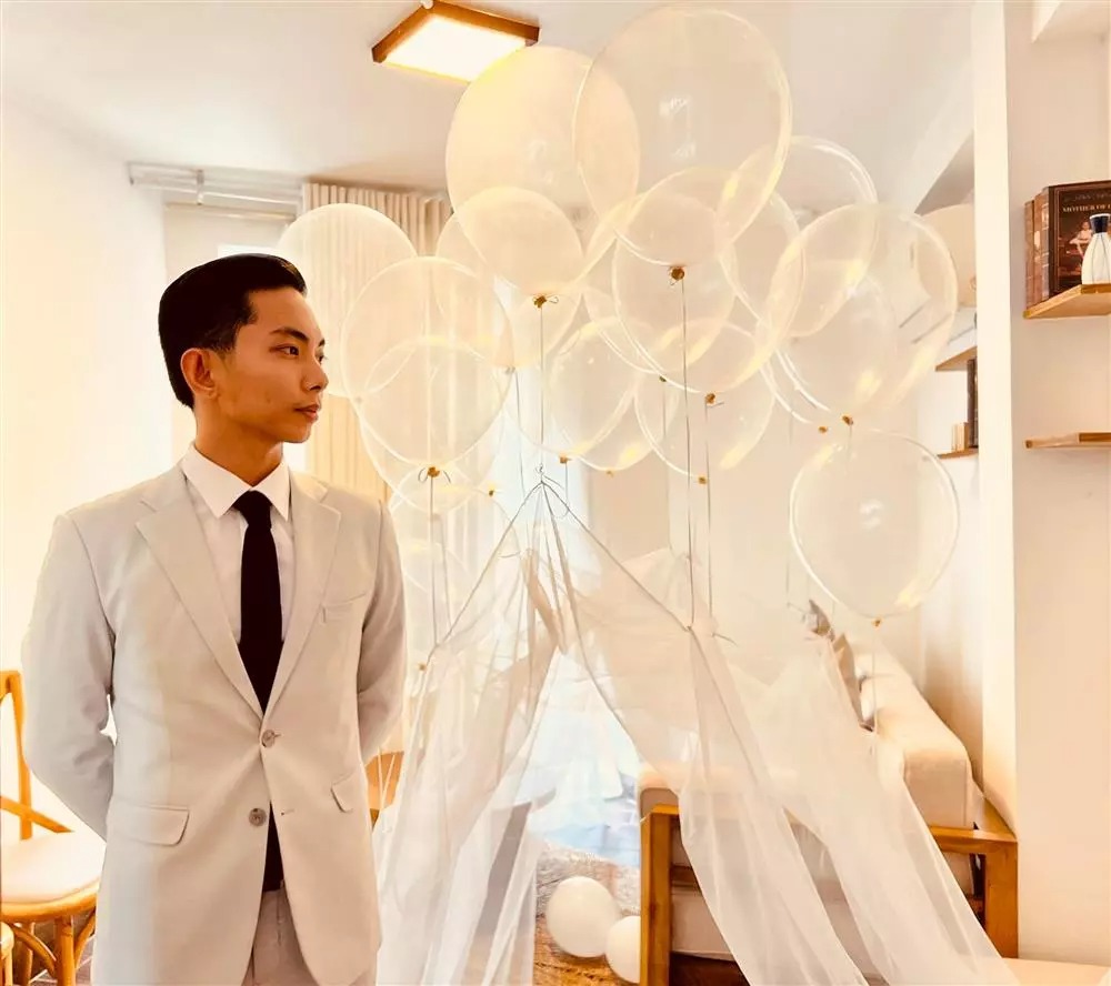 Mới đây, Phan Hiển chia sẻ loạt ảnh gây chú ý trên Fanpage và Facebook cá nhân. Trong ảnh, nam kiện tướng dancesport diện vest trắng bảnh bao, lịch lãm. Anh tạo dáng trong một căn phòng có ánh sáng chan hòa, bóng bay lãng mạn.