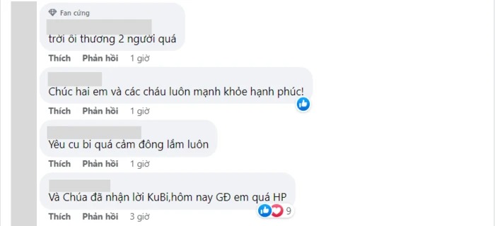 Đoạn clip này nhanh chóng nhận được sự quan tâm đặc biệt của cư dân mạng. Dưới phần bình luận, đông đảo netizen đã để lại lời khen ngợi cho tình cảm quá đỗi ngọt ngào của Kubi đối với ba mẹ. Đồng thời, dân tình cũng gửi lời chúc tốt đẹp đến với gia đình nhỏ của Khánh Thi - Phan Hiển.