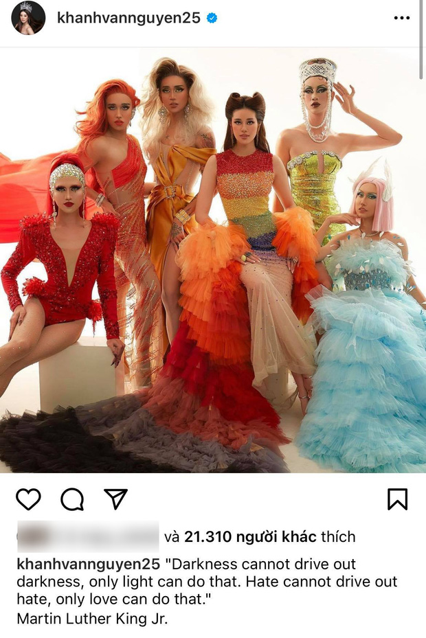Không lên tiếng phân bua hay lý giải điều gì, rạng sáng ngày 18/5 (giờ Việt Nam tương đương ngày 17/5 ở Mỹ) Khánh Vân đã có động thái tôn vinh những người thuộc cộng đồng LGBT. Được biết, ngày 17/5 hàng năm là ngày thế giới lên tiếng chống lại nạn kỳ thị và phân biệt đối xử với người thuộc cộng đồng song tính, đồng tính và chuyển giới (LGBT), Khánh Vân cũng đã góp tiếng nói bằng cách khoe bộ ảnh đặc biệt bên loạt nghệ sĩ như BB Trần, Hải Triều, Lynk Lee... để thể hiện sự tôn trọng dành cho những người dám sống là chính mình.