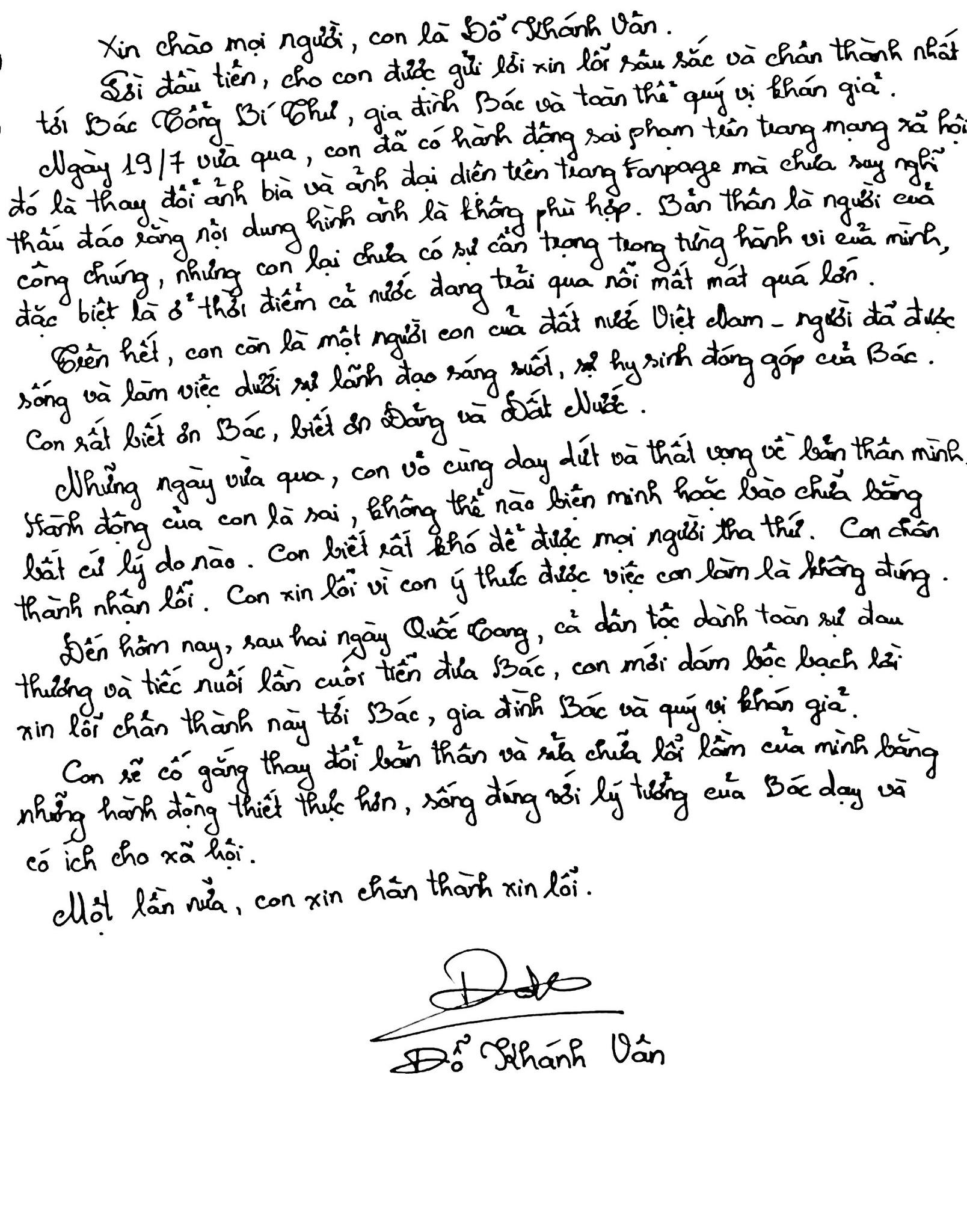 "Bản thân là người của công chúng nhưng tôi không cẩn trọng trong hành vi… Những ngày qua, tôi day dứt và thất vọng về bản thân. Hành động của tôi là sai, tôi không biện minh với bất cứ lý do nào…", Khánh Vân cho biết. Nữ diễn viên xin lỗi và cố gắng sửa đổi bản thân bằng hành động thiết thực hơn trong tương lai.