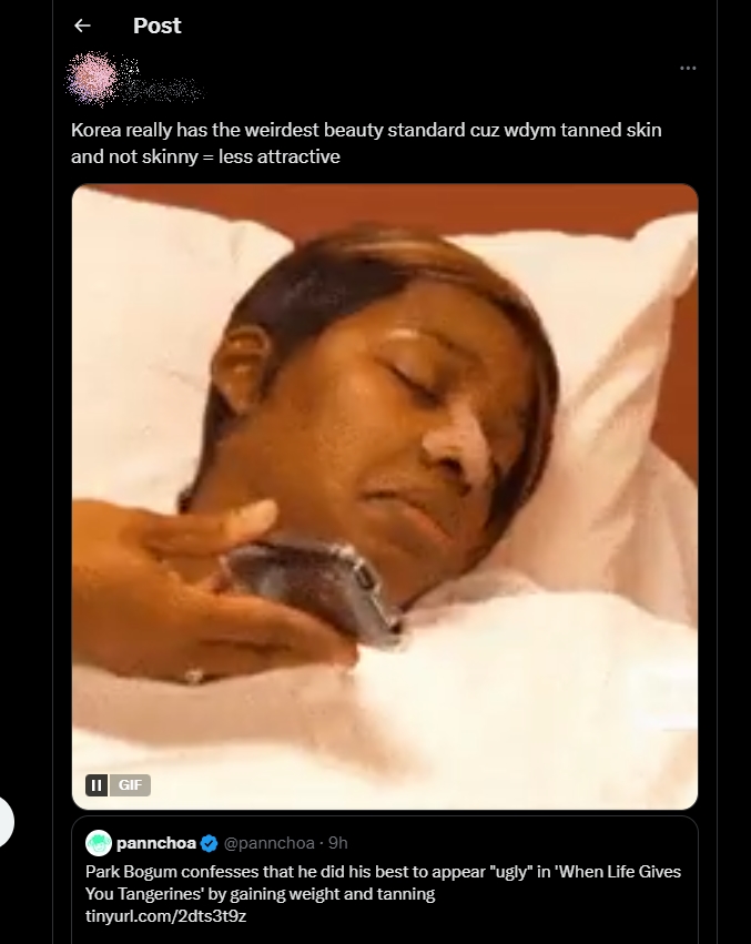 Trong khi đó, cư dân mạng quốc tế lại phản ứng gay gắt hơn. Trên nền tảng X, không ít bài đăng trích dẫn lại chia sẻ của Park Bo Gum về việc anh phải nhuộm da - tăng cân kèm theo câu hỏi, chất vấn dành cho gu thẩm mỹ của người Hàn. Một bài đăng được khá nhiều người quan tâm hiện nay với nội dung: "Hàn Quốc thực sự có tiêu chuẩn sắc đẹp kỳ lạ nhất, da rám nắng và không gầy bằng kém hấp dẫn?"