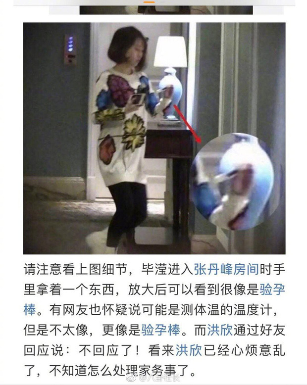 Khi soi kỹ những hình ảnh bẳng chứng, netizen còn cho rằng có vẻ như Tất Huỳnh đang cầm 1 que thử thai chạy vội vào phòng Trương Đan Phong, làm dấy lên nghi vấn cô đã có thai với nam diễn viên. Dù nam diễn viên "Hoa Thiên Cốt" ra sức phủ nhận những thông tin nói trên song công chúng vẫn không ngừng "gạch đá" anh, ủng hộ Hồng Hân ly hôn chồng.