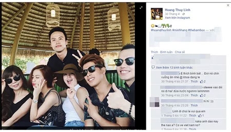Sau đó, Hòa Minzy cũng không quên đáp trả Đại Nhân khi đăng ảnh cô xinh nhất còn hai chàng trai bên cạnh thì làm mặt xấu |