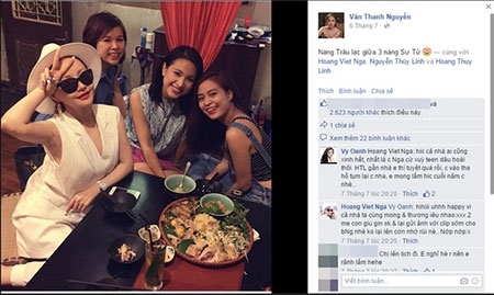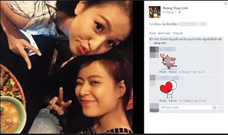 Hoàng Thùy Linh check in tại quán ăn của Vân Hugo và khoe bức ảnh chụp cùng bà chủ. Trong bức hình này Vân Hugo không được xinh cho lắm và góc chụp cho thấy mặt cô còn hơi to. Bên cạnh đó Hoàng Thùy Linh chụp nghiêng nên khuôn mặt cô khá nhỏ nhắn |