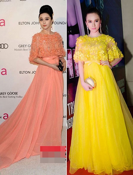 Bộ váy gốc của Phạm Băng Băng là từ thương hiệu Elie Saab, bộ váy của Angela Phương Trinh là hàng nhái, chỉ khác hoa văn và màu sắc. |
