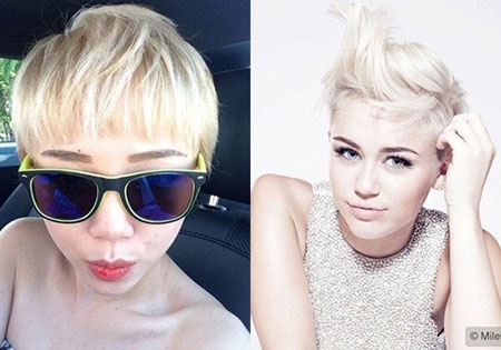 Cả Tóc Tiên và Miley Cyrus đều để kiểu tóc không thể ngắn hơn rất cá tính và mang hơi hướng nghịch ngợm, nổi loạn với gam màu vàng sáng. |