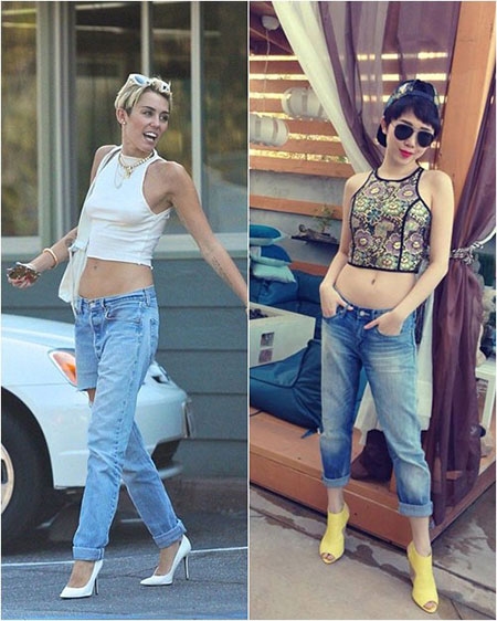 Sự giống nhau không hề nhỏ trong trang phục dạo phố của Tóc Tiên và Miley Cyrus. |