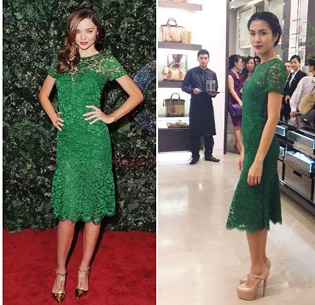 Tăng Thanh Hà đụng hàng với Miranda Kerr trong bộ váy màu xanh ngọc lục bảo của Burberry, tuy nhiên nếu Hà Tăng kết hợp với một đôi giầy khác thanh mảnh hơn thì sẽ đẹp hơn nữa. |