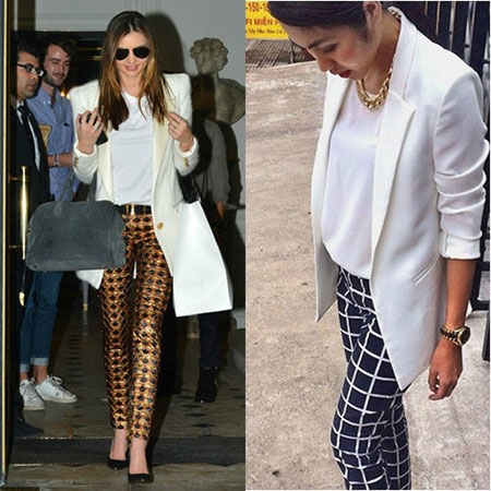 Cả hai người đẹp đều rất sành điệu với cách kết hợp áo blazer và sơ mi trắng cùng quần mang họa tiết hình học. |