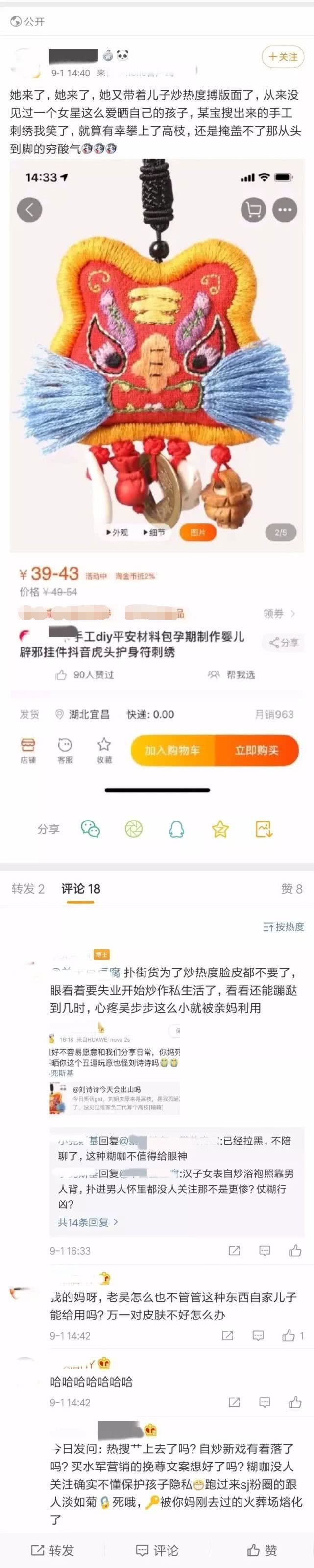 Tuy nhiên, mới đây một cư dân mạng được cho là người hâm mộ của Ngô Kỳ Long đã lên tiếng mỉa mai Lưu Thi Thi cùng bức hình ghi lại chiếc vòng hộ mệnh do chính tay cô thêu cho con trai. Người này cho rằng, mỹ nhân "Bộ Bộ Kinh Tâm" cố ý lấy hình con trai ra để gây sự chú ý từ dư luận.
