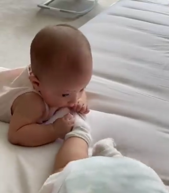 Ở một góc khác, cậu nhóc Leon bị chị gái đòi "gặm" chân thì gương mặt lại trông rất hoang mang, nhìn vô cùng hài hước.