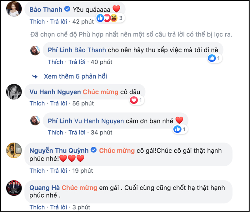 Đây cũng là lần đầu tiên cô chia sẻ khoảnh khắc liên quan tới ngày trọng đại nên đã nhận được nhiều sự quan tâm từ khán giả. Trong đó, rất đông bạn bè nghệ sĩ thân thiết với Phí Linh như diễn viên Bảo Thanh, Thu Quỳnh, ca sĩ Bằng Kiều, Phương Ly… đã gửi lời chúc phúc tới cô trước ngày lên xe hoa. Đa số đều cho rằng dù rất bận rộn với các lịch trình cá nhân nhưng sẽ cố gắng sắp xếp thời gian để tới tham dự hôn lễ của MC Phí Linh vào ngày 14/6 tới.