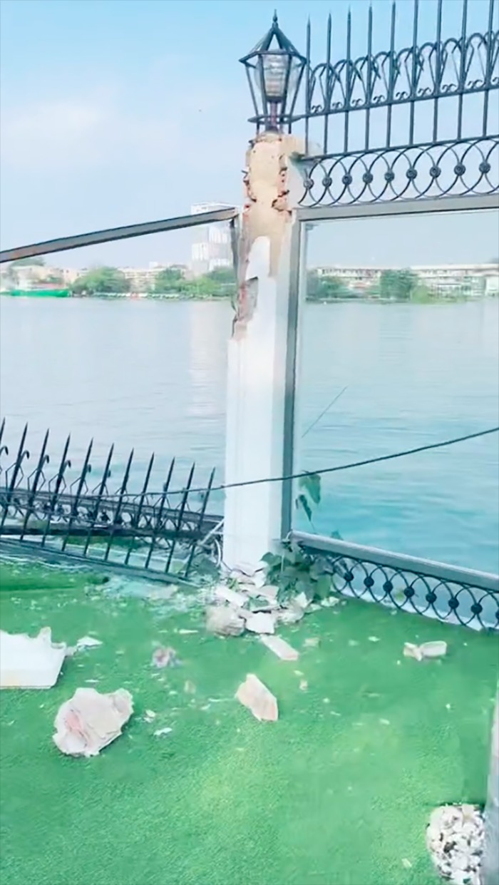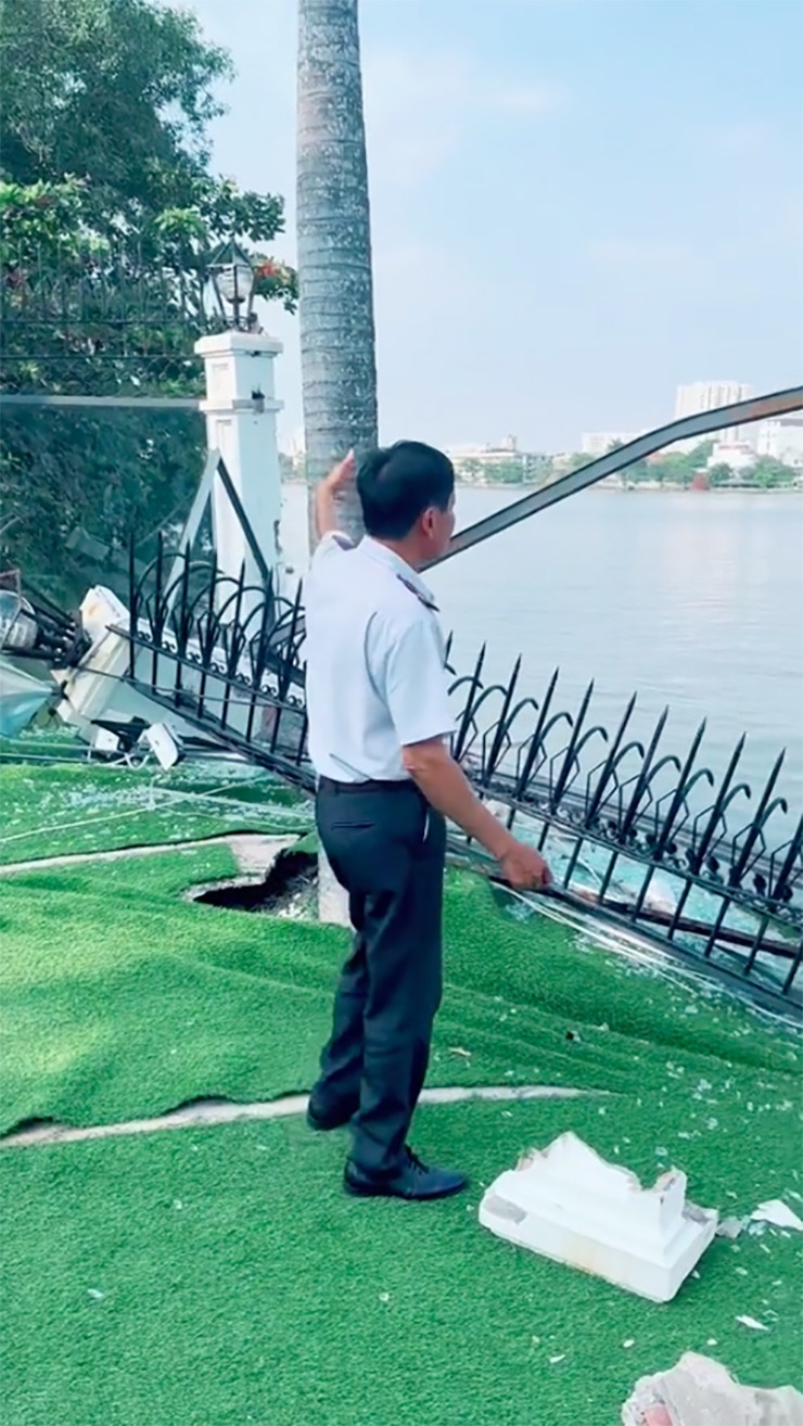 Vũ Khắc Tiệp quay clip ghi lại hình ảnh phần cổng ngăn cách giữa căn nhà và phần bờ sông đã bị tàu va chạm, giờ chỉ còn đống đổ nát. Nhiều người đưa ra phỏng đoán “ông trùm chân dài” sẽ phải bỏ ra một số tiền kha khá để sửa chữa.