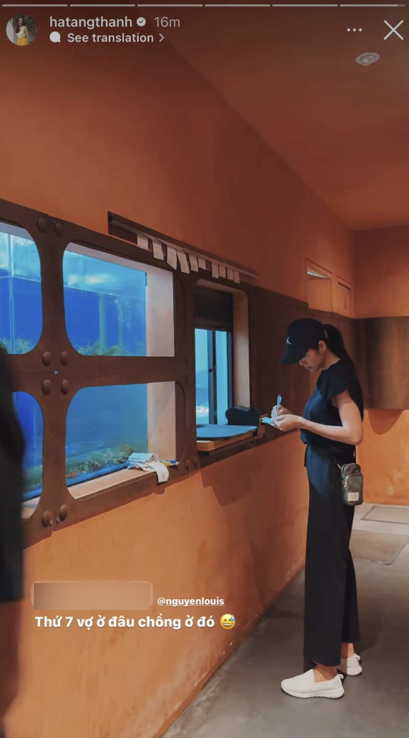 Trong hình, Tăng Thanh Hà đang tự làm nhân viên phục vụ trong chính nhà hàng do mình quản lý. Đi kèm với hình ảnh là dòng trạng thái: "Thứ 7 vợ ở đâu chồng ở đó" và không quên gắn tên tài khoản Louis Nguyễn của ông xã.