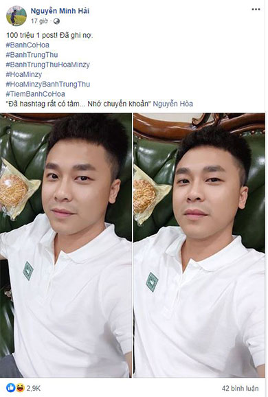 Là một trong những người thân cận nhất của Hòa Minzy, tất nhiên bạn trai Minh Hải của cô phải là người cầm trên tay những chiếc bánh đầu tiên. Anh chàng cũng hào hứng khoe lên trang cá nhân ảnh selfie cùng với bánh trung thu mới ra lò. Điều đáng nói, Minh Hải còn lầy lội cho biết bài đăng quảng cáo bánh này trị giá 100 triệu, đã ghi nợ cho Hòa Minzy và nhắc cô sớm chuyển khoản.