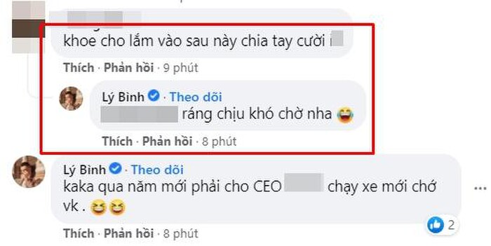 Bên cạnh những lời chúc mừng dành cho Jolie Phương Trinh vì có được một người bạn trai quá cưng chiều thì cũng có một vài bình luận đả kích cô. Cụ thể, một tài khoản để lại bình luận: "Khoe cho lắm vào sau này chia tay lại cười...". Không nhẫn nhịn, Jolie Phương Trinh liền lên tiếng đ.áp trả: "Ráng chịu khó chờ nha".