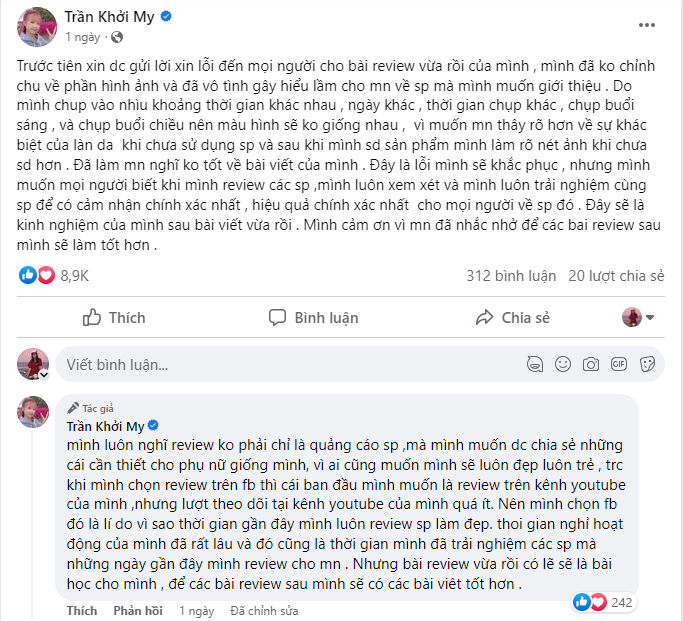 Tối ngày 17/7, Khởi My bất ngờ lên tiếng xin lỗi trên trang cá nhân về bài review sản phẩm của mình chia sẻ không lâu trước đây. Cụ thể, nữ ca sĩ viết: "Trước tiên xin được gửi lời xin lỗi đến mọi người cho bài review vừa rồi của mình, mình đã không chỉn chu về phần hình ảnh và đã vô tình gây hiểu lầm cho mọi người về sản phẩm mà mình muốn giới thiệu".