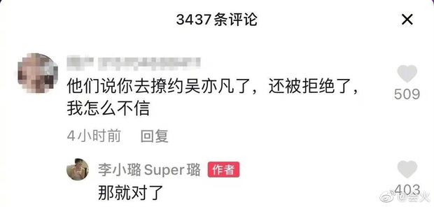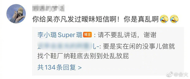 Trên MXH, đã có bình luận viết: "Cô gửi tin nhắn mập mờ với Ngô Diệc Phàm đấy à? Cô đúng là loạn thật", vợ cũ Giả Nãi Lượng gay gắt đáp trả: "Đừng có mà nói năng linh tinh. Cám ơn".