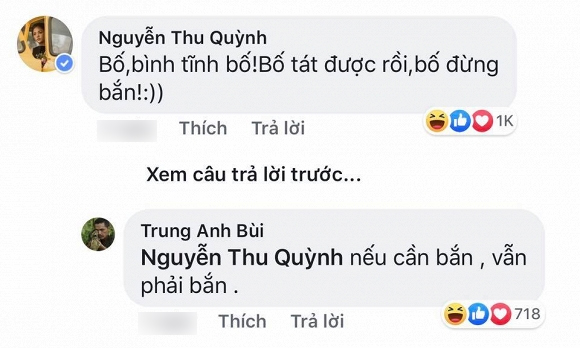 Cuộc nói chuyện giữa nghệ sĩ Trung Anh với Thu Quỳnh, Trọng Hùng, Quốc Trường, MC Tuấn Tú,... đã được một fanpage mới chụp lại và nhận được phản ứng thích thú của cư dân mạng: "Vào tầm ngắm của bố quốc dân", "Chú Bổng nhập vào bố rồi. May mà còn có hướng giải quyết, quả này Khải trốn nhanh đi nhé", "Cái Dương đâu rồi nhỉ? Sao không xách dao theo phụ bố?", "Bên phán xử bị bố chặt cả ngón tay. Qua này bắn bay đầu", "Bố vĩ đại theo cách đơn giản nhất, bố quốc dân chính là đây"....
