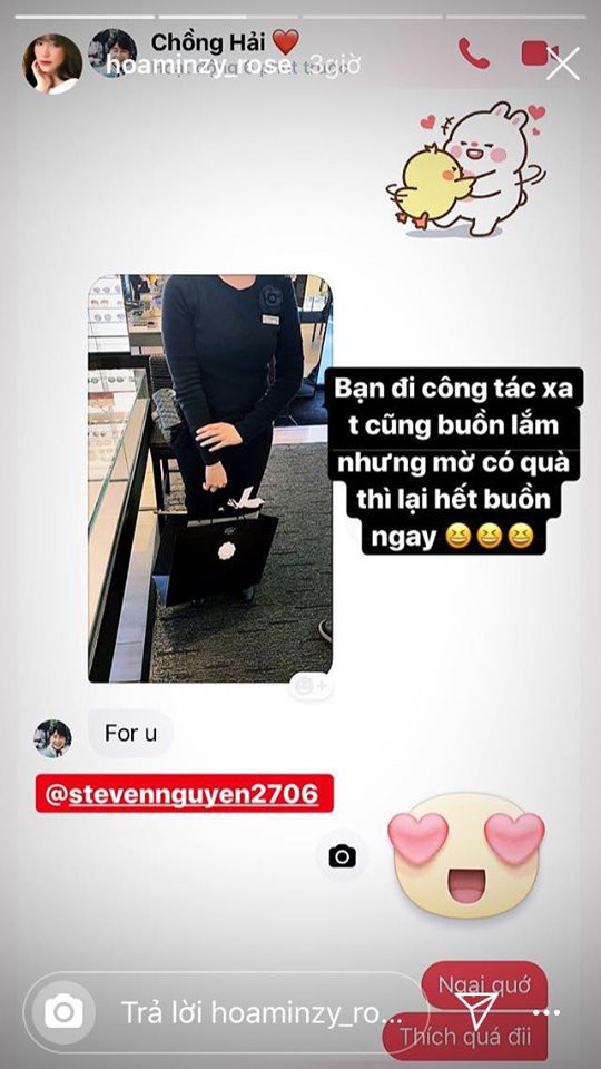 Mới đây, nữ ca sĩ đăng tải trên instagram story đoạn hội thoại ngọt ngào với bạn trai khi anh đi công tác xa. Theo đó, bạn trai Hòa Minzy đã đặc biệt mua một món quà hàng hiệu tặng cho cô. Hành động của anh khiến Hòa Minzy vui mừng cảm thán: "Bạn đi công tác xa tớ cũng buồn lắm nhưng mà có quà thì lại hết buồn ngay".