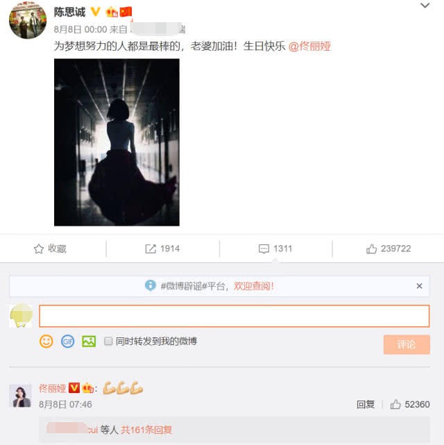 Trước đó không lâu, Đồng Lệ Á cùng ông xã Trần Tư Thành vẫn thường xuyên có sự tương tác ngọt ngào trên mạng xã hội Weibo. Gần đây nhất, nam diễn viên còn gửi lời chúc mừng sinh nhật bà xã lên mạng xã hội: "Những người làm việc chăm chỉ vì ước mơ của mình là điều tuyệt vời nhất, bà xã cố lên, chúc mừng sinh nhật em".