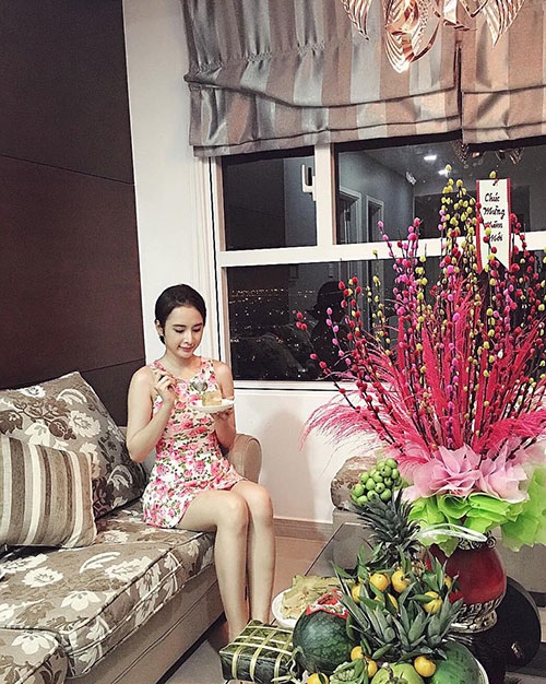 Nhà Angela Phương Trinh đã chuẩn bị sẵn sàng cho Tết với hoa tươi, mâm ngũ quả. Cô chia sẻ ngày Tết thích nhất là được ăn bánh chưng. |