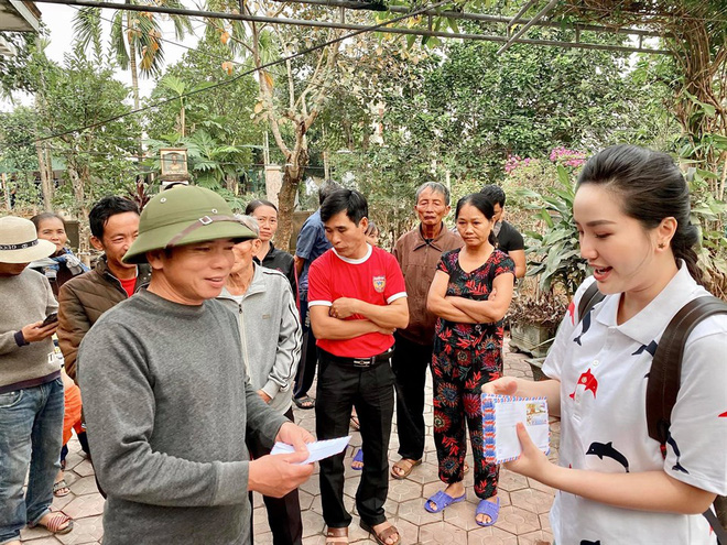 Đáng chú ý, giọng ca "Là con gái phải xinh" còn ghi điểm tuyệt đối nhờ cách làm từ thiện thông minh, tinh tế cùng lối cư xử gần gũi, khéo léo. Bà xã đại gia Phan Lĩnh chia tiền ra từng phong bì nhỏ, mỗi khi trao đến ai đều cúi đầu chào rất lễ phép. Đặc biệt, cô còn tự xưng là "con" và bày tỏ niềm đồng cảm với những khó khăn của người dân sau bão lũ.