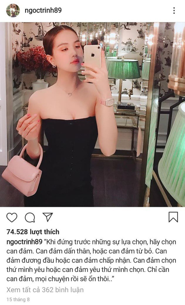 Cách đây gần 1 năm, Ngọc Trinh từng khiến dân mạng chú ý khi chính thức thông báo rằng mình đã hết ế. Thậm chí cô còn không ngần ngại tiết lộ bạn trai là người hơn cô 20 tuổi và đã yêu nhau được 2 năm. "Nữ hoàng nội y" tiết lộ được bạn trai bóp chân, cưng phụng như bà hoàng, thường tặng những món quà đắt đỏ,... Thế nhưng khoảng 5 tháng trở lại đây, Ngọc Trinh không còn nhắc gì đến bạn trai nữa. Thay vào đó, cô liên tục đăng hàng loạt status triết lý về chuyện tình yêu tan vỡ khiến công chúng hoài nghi chuyện tình cảm của người đẹp gặp trục trắc.