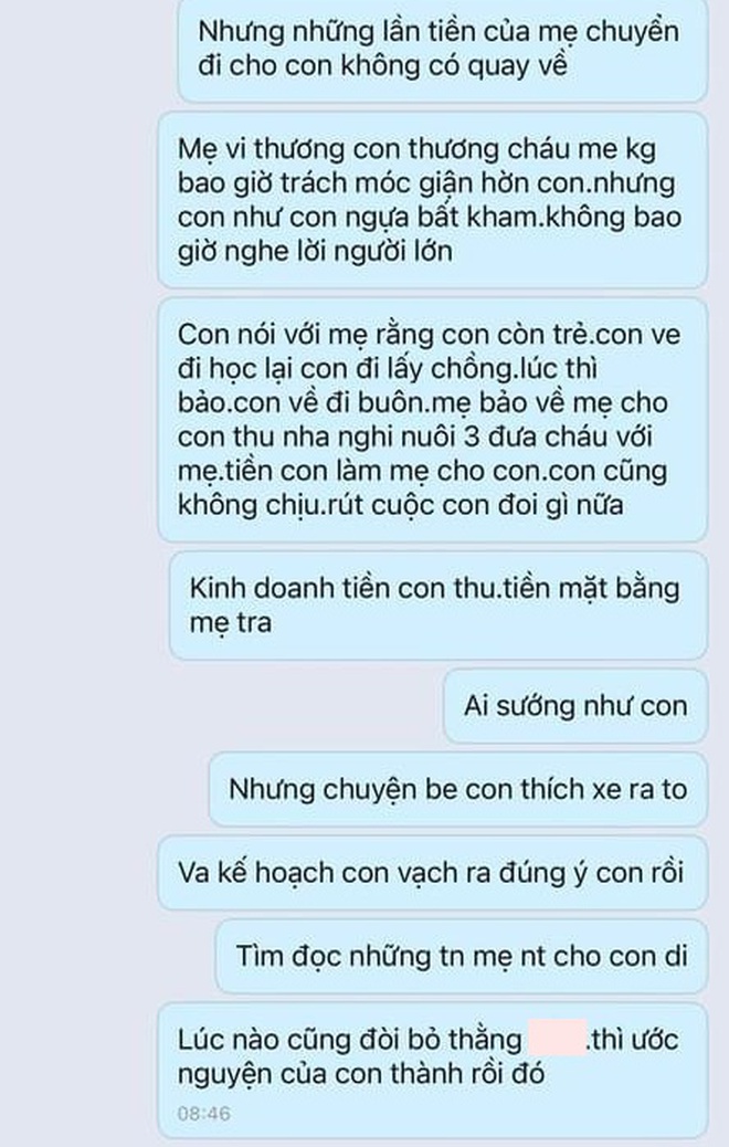 Bà M nhắn nhủ đến con dâu giữa drama: "Mẹ nói con về phụ kinh doanh nuôi 3 đứa cháu với mẹ, tiền con làm mẹ cũng sẽ cho con nhưng con không chịu. Kinh doanh tiền con thu, tiền mặt bằng mẹ trả, ai sướng như con nữa?".