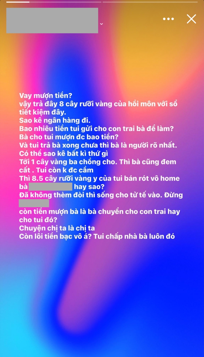 Sau đó, Z.D đã đáp trả lại, cô cho biết nếu mẹ chồng đòi nợ thì nhà chồng cũng phải trả cho cô những gì đã bỏ ra. Theo lời Z.D, cô đã đưa cho chồng 8,5 cây vàng (khoảng 654 triệu đồng, theo tỷ giá hiện tại) cùng với sổ tiết kiệm để góp vốn làm homestay. Số vàng này là của hồi môn trong đám cưới và nhiều hơn so với những gì mẹ chồng cho cô mượn.