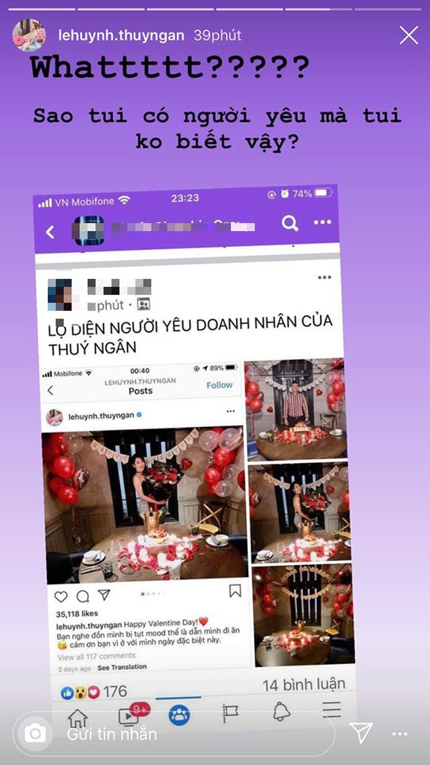 Sau tin đồn này, Thúy Ngân tiếp tục dính nghi vấn đang trong mối quan hệ yêu đương với một người đàn ông chưa rõ danh tính. Dân mạng chỉ ra người này cũng có mặt trong bữa tiệc Valentine của Thúy Ngân, rất có thể chính là người đã tự tay chuẩn bị mọi thứ từ hoa, bánh kem, trang trí... cho cô nàng nhân ngày đặc biệt này. Trước những lời đồn đoán, nữ diễn viên sinh năm 1991 đã ngay lập tức phủ nhận thông qua instagram.