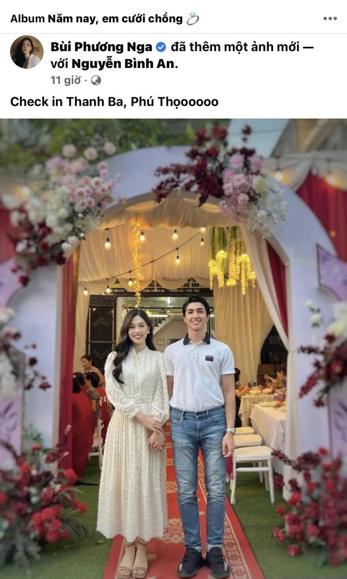 Trước đó, trên trang cá nhân Phương Nga “nhá” một vài khoảnh khắc sánh đôi bên Bình An trong đám cưới ở quê chồng kèm dòng chú thích: “Check in Thanh Ba - Phú Thọ”. Phương Nga xinh đẹp trong chiếc đầm trắng tựa nàng thơ còn Bình An bảnh bao trong trang phục giản dị.