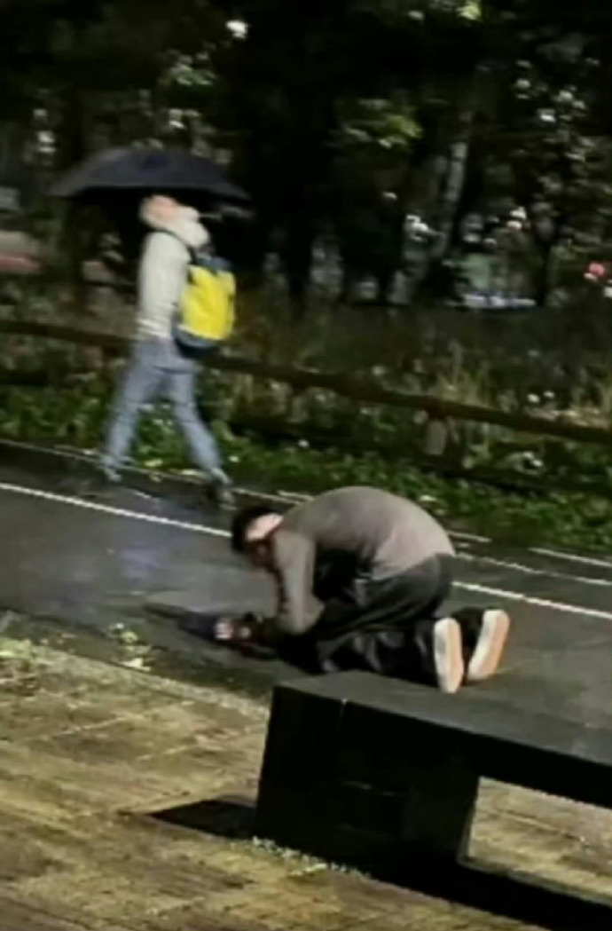 Trong bức ảnh lan truyền trên mạng, Uông Tiểu Phi được nhìn thấy quỳ gối giữa cơn mưa tầm tã, được cho là để thể hiện tình cảm sâu nặng dành cho vợ cũ, Từ Hy Viên.