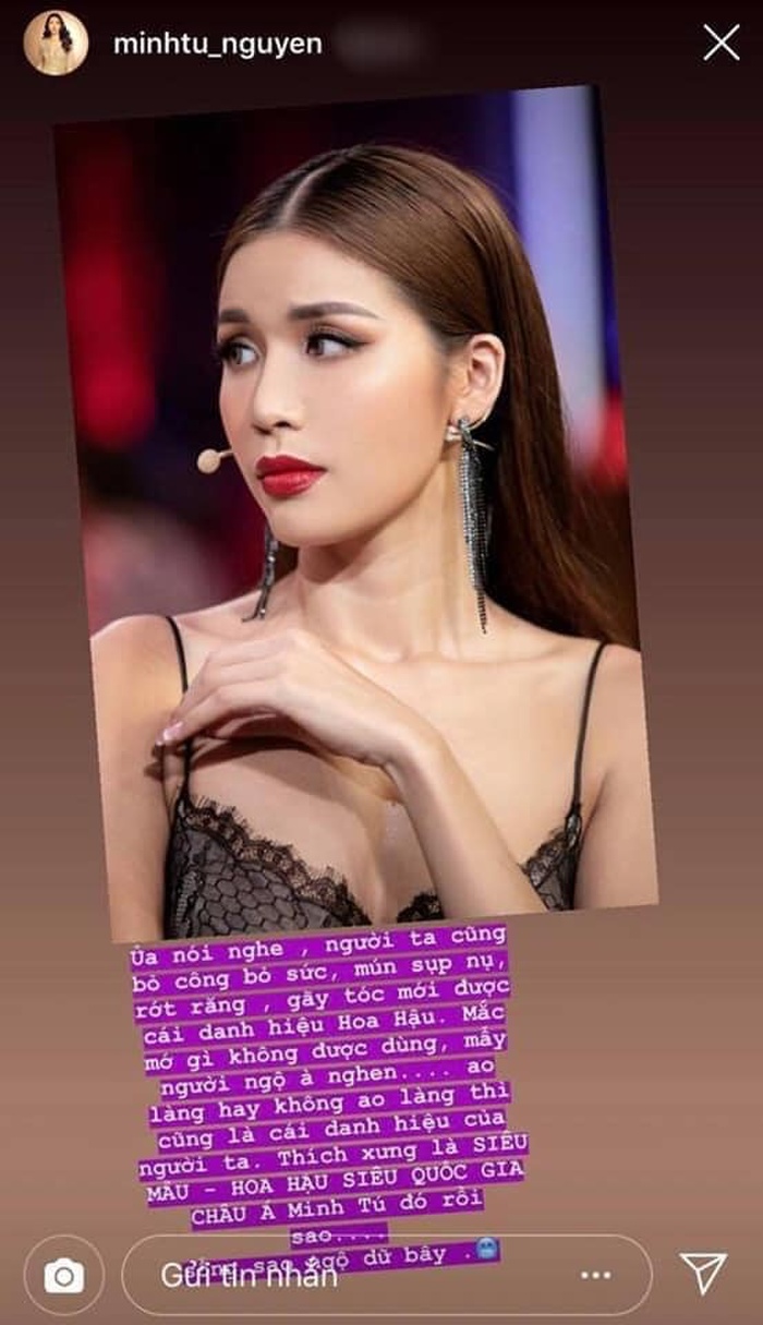Mới đây, cô Tiên răng thỏ đã nổi đóa và đăng tải đoạn chia sẻ trên Instagram với nội dung bất bình: "Người ta cũng bỏ công, bỏ sức rớt răng, gãy tóc mới có được danh hiệu hoa hậu mắc mớ gì không dùng. Ao làng hay không ao làng thì cũng là danh hiệu của người ta. Thích xưng là siêu mẫu - Hoa hậu siêu quốc gia châu Á đó rồi sao".