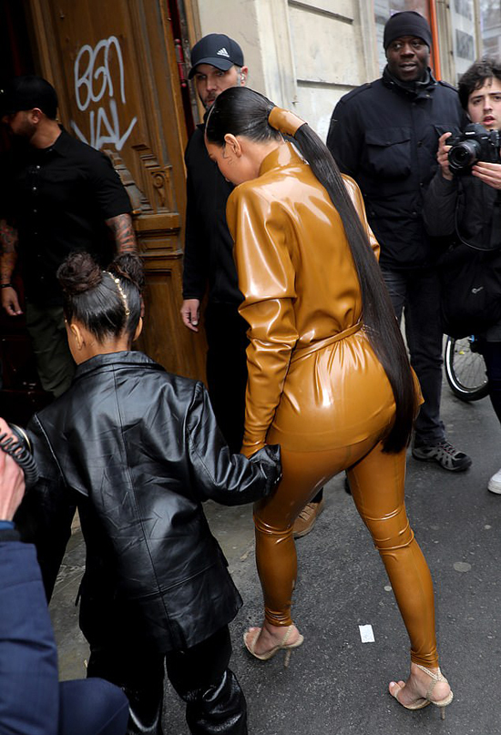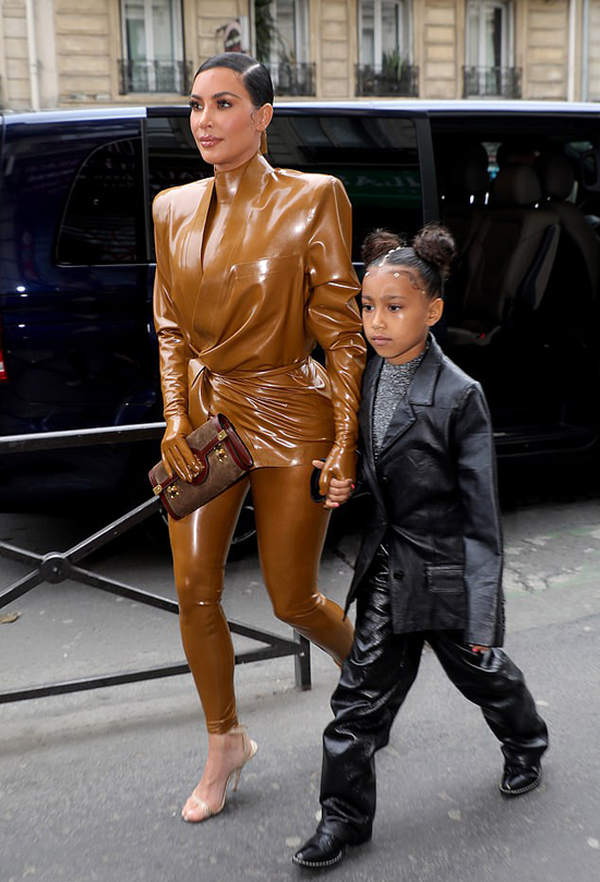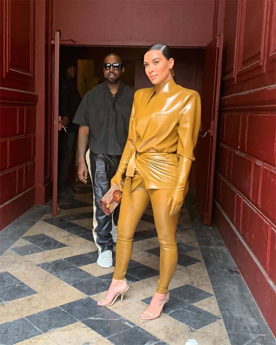Kim "Siêu vòng ba" lựa chọn bộ đồ kín cổng cao tường nhưng vẫn nóng bỏng khi đi xem show thời trang cùng chồng con.