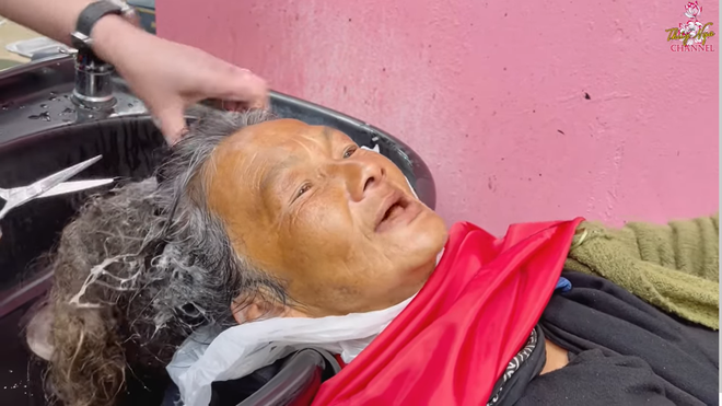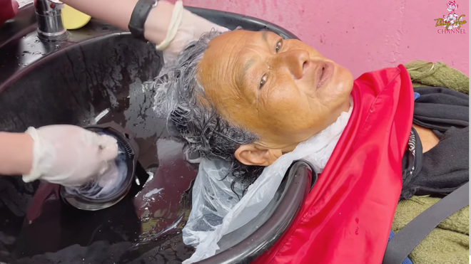 Tiếp đó, Kim Ngân còn được chủ quán rửa mặt cẩn thận bằng bông rồi nhuộm tóc đen. Sau 7 lần gội đầu, đến lần thứ 8 mới có bọt nổi lên từ tóc Kim Ngân.