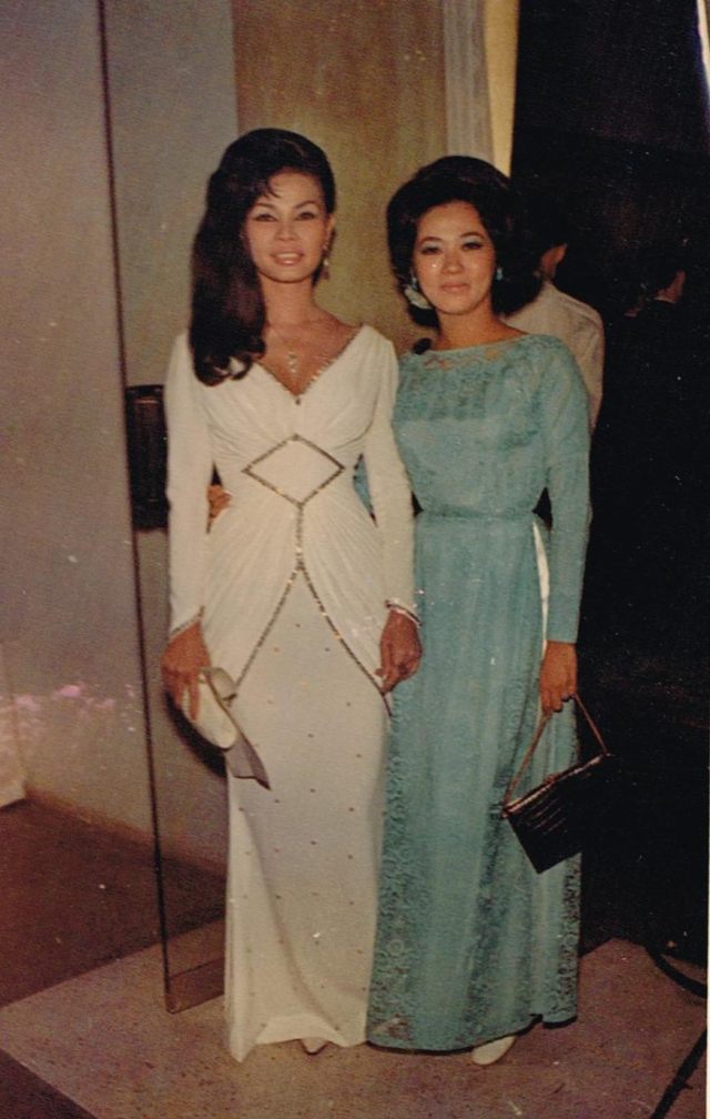 Kim Vui mặc áo đầm hở vai mầu đỏ, và mang găng đen kéo quá khửu, trông chị bốc lửa như Rita Hayworth trong phim Gilda".