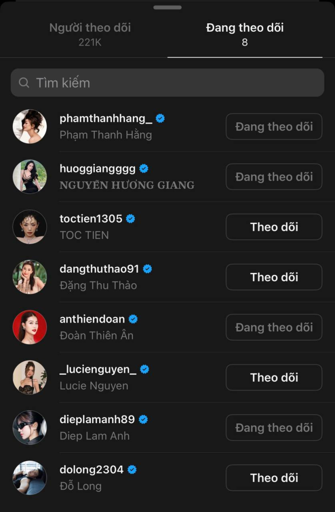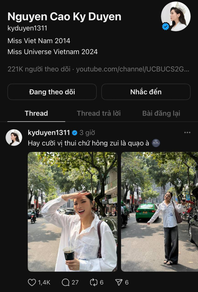 Theo đó, trên nền tảng mạng xã hội Threads có hơn 220k người theo dõi của Hoa hậu Kỳ Duyên, cư dân mạng phát hiện ra cô không còn theo dõi siêu mẫu Minh Triệu. Hiện tại, người đẹp sinh năm 1996 đang theo dõi 8 người là nhà thiết kế, người nổi tiếng hoạt động trong showbiz Việt. Đặc biệt, trong số những người này còn có tài khoản của Hoa hậu Đoàn Thiên Ân. Động thái này của Kỳ Duyên đang được cư dân mạng bàn tán xôn xao trên mạng xã hội.
