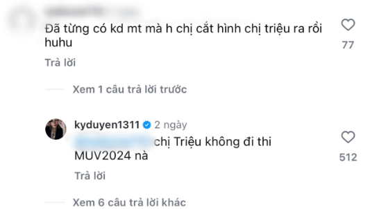 Trước loạt bình luận liên quan đến điều này, người đẹp sinh năm 1996 đã lên tiếng giải thích: "Chị Triệu không đi thi Miss Universe Vietnam 2024 mà". Cô cho rằng nội dung mình muốn đề cập là cuộc thi sắp tham dự nên mới đăng ảnh như thế.