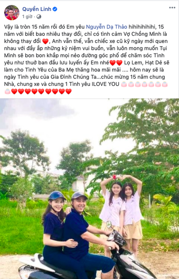 Mới đây nhất, trên trang cá nhân, MC Quyền Linh bất ngờ chia sẻ hình ảnh gia đình hạnh phúc, kèm lời nhắn gửi đầy yêu thương tới bà xã trong dịp 15 năm yêu. "Vậy là tròn 15 năm rồi đó em yêu Nguyễn Dạ Thảo.15 năm với biết bao nhiêu thay đổi, chỉ có tình cảm vợ chồng mình là không thay đổi. Anh vẫn thế, vẫn chiếc xe cũ kỹ ngày mới quen nhau với đầy ắp những kỷ niệm vui buồn, vẫn luôn mong muốn tụi mình sẽ bon bon khắp mọi nẻo đường góc phố để chăm sóc tình yêu như thuở ban đầu lưu luyến ấy em nhé. Lọ Lem, Hạt Dẻ sẽ làm cho tình yêu của ba mẹ thăng hoa mãi mãi. Hôm nay sẽ là ngày tình yêu của gia đình chúng ta. Chúc mừng 15 năm chung nhà, chung xe và chung 1 tình yêu. I love you", MC Quyền Linh viết.