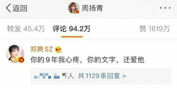Vốn không hề liên quan đến drama này, Trịnh Sảng lại khiến nhiều người bất ngờ khi có động thái quan tâm đến sự việc khi không chỉ nhấn nút like mà còn thẳng thắn bình luận vào bài viết của Chu Dương Thanh: "Em đau lòng thay 9 năm thanh xuân của chị, bài viết của chị cho thấy chị vẫn yêu anh ấy nhiều lắm".